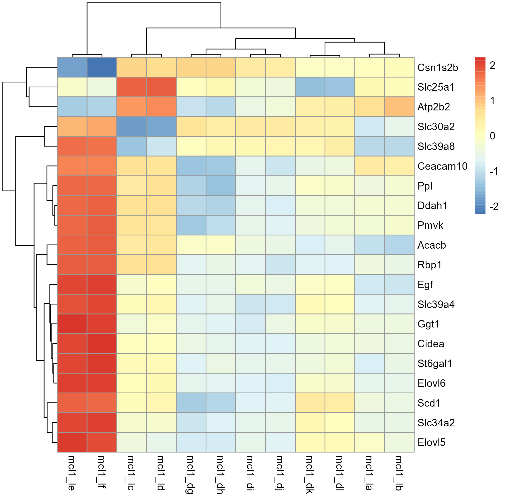 # Read all the files and clean the column namesheatmap_genes <-read_tsv("R/byod/solutions_for_my_datasets/data/heatmap_genes")DE_results <-read_tsv("R/byod/solutions_for_my_datasets/data/limma-voom_luminalpregnant-luminallactate")DE_results <- janitor::clean_names(DE_results)normalized_counts <-read_tsv("R/byod/solutions_for_my_datasets/data/limma-voom_normalised_counts")normalized_counts <- janitor::clean_names(normalized_counts)# combine tablesgenes <-left_join( DE_results, normalized_counts,by =c("entrezid", "symbol", "genename")) |>select(-entrezid, genename)